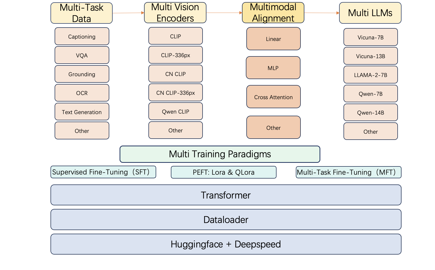 As more and more models are published on Huggingface community, there will be more open-source vision encoders and LLMs. Each of these models has their own specialties, e.g. Code-LLama is good at code-related tasks but has poor performance for Chinese tasks. Therefore, we built CodeFuse-VLM framework to support multiple vision encoders, multimodal alignment adapters, and LLMs to adapt different types of tasks.